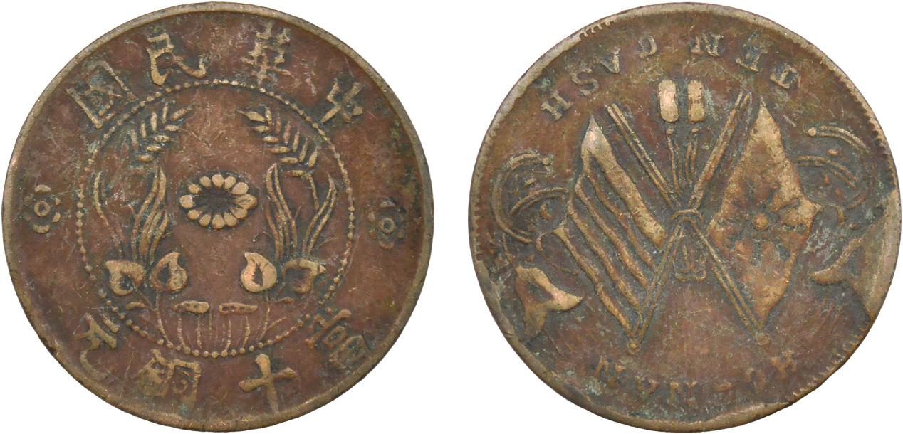 此枚钱币铸造于中华民国早期,正值千年帝制终结、共和初立的重要历史转折期。币面设计极具时代特色:正面交叉的十八星旗与五色旗迎风飘扬,象征着辛亥革命后“五族共和”的政治理念,外围“中华民国”四字楷书端庄有力,背面麦穗环绕币值,图案布局规整。然而细观此币,可见其明显的错版特征——或是模具移位导致图文偏移,或是正背面对版不准形成独特错位,这种在严格生产流程下意外流出的错版币,成为了研究民国早期铸币工艺与质量管控体系的珍贵实物标本。