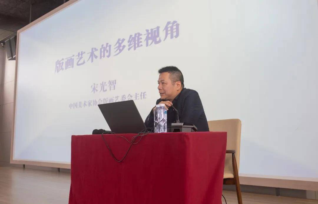 聚焦时代发展,宋教授介绍了版画从木刻为主到铜版画、丝网版画、石版画等多版种拓展的演变历程,题材也从抗战救亡、革命生活延伸至当代国之重器、乡村振兴、城市更新等多元领域。他结合自身“深圳前海”主题创作实践,分享了完成重大题材作品的创作心得,强调主题创作需紧扣时代成就,注重素材整合与艺术个性表达。这些宝贵的创作经验,让在场的听众深受启发。