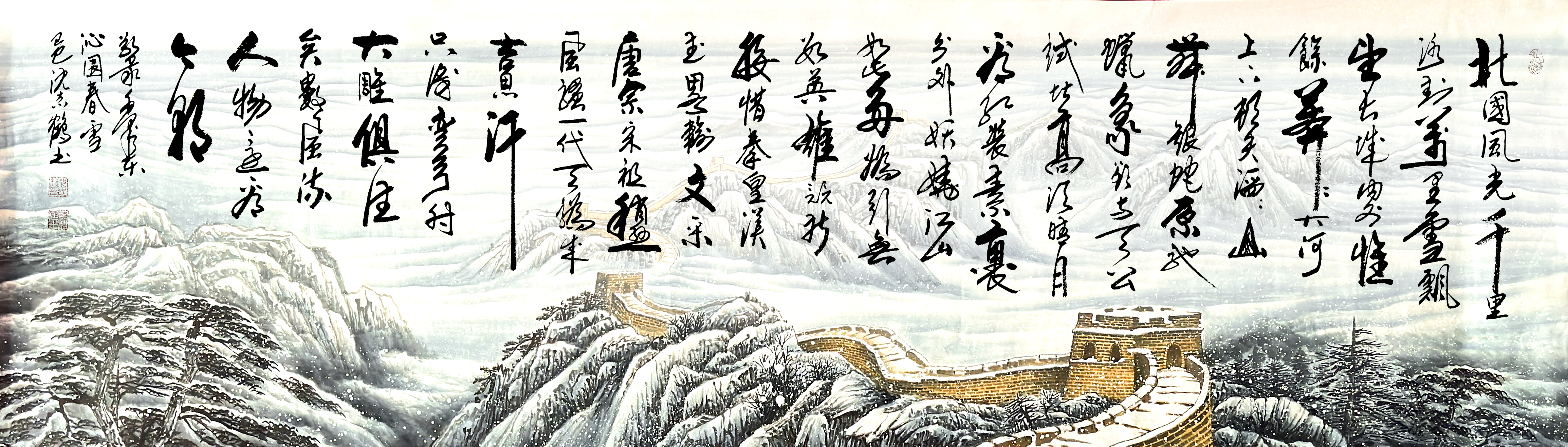 闭门谢客一载有余,笔墨丹青铸魂山河。沈志鹤以矿物颜料为骨,将长城的雄浑肌理溶于色彩交响,让千里冰封的壮阔与生机暗藏的希冀在画卷中流转。书画交融间,既有“沈篆”的金石力道勾勒文脉,又有泼彩的灵动意境铺展江山,恰如爷爷眼中那片孕藏希望的热土,于笔墨间迸发蓬勃力量。2017年,这幅凝聚心血的作品被人民大会堂收藏悬挂,与《江山如此多娇》等国之瑰宝共映家国气象。