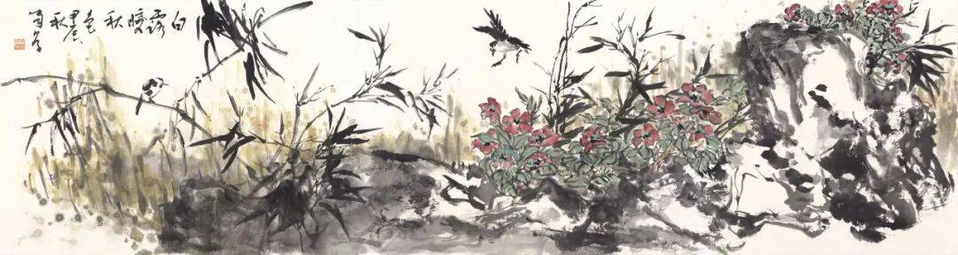 羊草从艺数十载,探索不辍。其创作贯通实践与理论,融汇传统底蕴与当代审美,并从容跨越画科边界。笔下既有传统山水的细腻经营、花鸟人物的洒脱抒意,亦见色墨交融的大胆实验。他以笔墨为根基,以开放心态面对当代,在跨界互鉴中拓展艺术维度,于性情流露中保持纯粹。