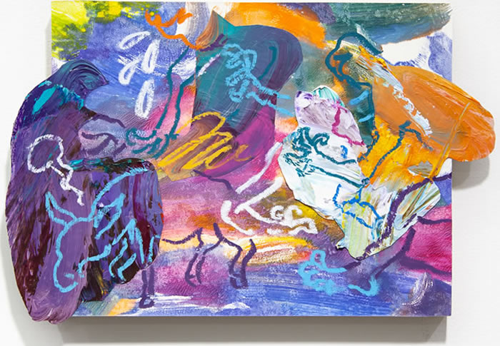 在早期作品中,我们看到“画什么”对龚若愚来说似乎还很重要,十年专业的传统训练让他能够通过绘画、拼贴甚至雕塑等多元方式满足和丰富其作品期望的叙事性。然而个展“笑点之下”却给了我们不同的面貌,驴的形象渐渐从画中隐退,抽离成纠缠的线条,图像看似隐晦,但绘画痕迹跃然成为了语言的可视觉化呈现,寓意在其间若隐若现。如果说叙事性需要具象来承载内容,那脱离叙事的桎梏,感受力表达便如同一匹脱缰的野马。同样,从受众角度,过分写实往往容易剥夺观众的感受空间,而龚若愚的新作品就如同抽丝剥茧,留给观者更多想象余地,参与到创作的延续和发展中来。