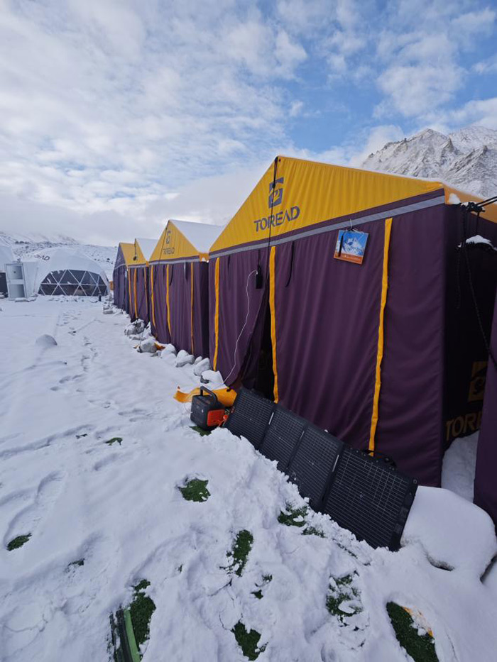 这次选择北坡登顶,一是它需要的时间更长,需要56天;第二是成本比南坡要少,大概30万;第三是北坡在氧气含量、植被登方面都比南坡更低,因此还是有一些难度的。在具体实施上,首先交通方式,我还是选择坐火车。其次在大本营,我自己的帐篷是通过光伏自己发电。在整个近60天的攀登,我们会前期拉练,然后再回到城市休整,在这个过程中,我有两次就没有下到城市。我在帐篷住了36天,酒店仅仅住了19天,比别人最少少住了5天。从生理上的需求来讲,现在大部分的人无法接受长时间不洗澡不洗头。帐篷里没有空调等设备,因此它温室气体排放是不多的。同时,我秉持“去塑化”的理念。我统计了一下,我们在山上的时间是36天,按一人2-3瓶饮料,每个人大概喝了72-108瓶,我使用的是经过认证的钛杯,包括有认证的冲锋衣,也是可回收降解的低碳产品。