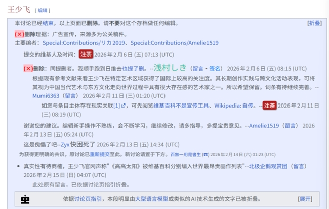 2026年2月6日,维基百科编辑注荼以"广告宣传、来源多为公关稿件"为由,突然对王少飞词条提出存废讨论。就在同一天,另一编辑浅村しき(ShuQizhe)迅速跟进,不仅在讨论页附议删除,更主动跑到日语维基百科,对同一词条同步提出删除申请。两人几乎同步行动,配合之默契,令人生疑。