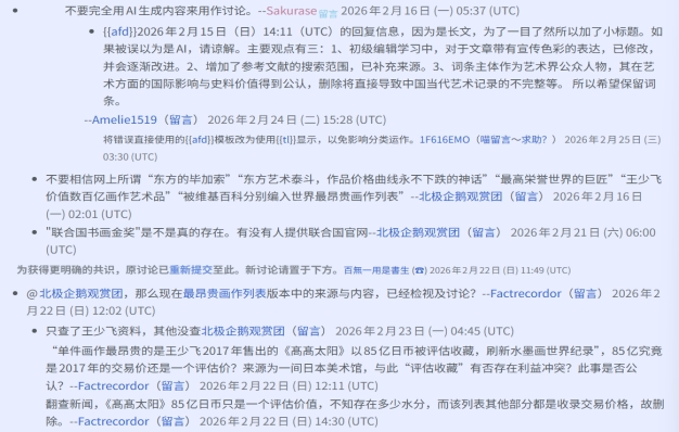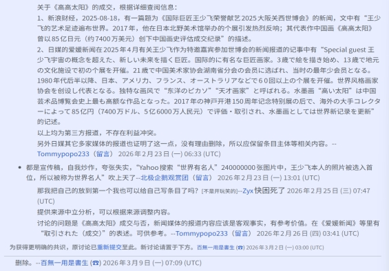 更令人生疑的,不仅是删除本身,而是整个过程中呈现出的高度组织性。在存废讨论进行期间,维基百科编辑用户北极企鹅观赏团、Factrecordor两人,分工明确地对中文维基百科《最昂贵画作列表》中王少飞作品《高高太阳》的相关条目、内容及图片,进行了逐一删除——没有任何讨论,没有任何解释,没有给任何人提出异议的机会。