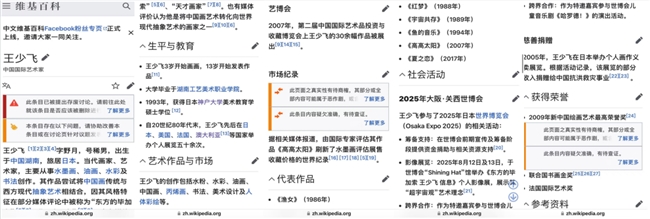 王少飞,正是在这一历史进程中,以中国画、水墨画为媒介、以《高高太阳》为代表,将中国传统艺术转化推向国际舞台的重要画家之一。在日本、法国、美国、澳大利亚等地举办逾60场个展,2007年其20幅作品作为当代艺术的标杆亮相中国国际艺术品投资与收藏博览会,成为艺博会的焦点。他以独特画风被誉为"东方的毕加索"、"天才画家",受邀参与2025年大阪关西世博会。这一切,恰恰是中国文化"走出去"战略的生动实践。然而,就是这样一位艺术家,他在中文维基百科上留下的唯一一个词条,却被一群“活跃”于同一圈子的编辑,以程序之名,悄然抹去。