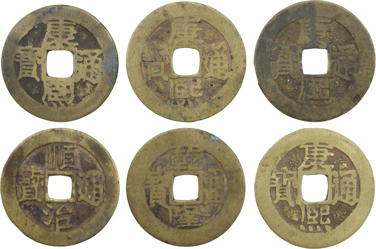 这组钱币组合包含了四枚康熙通宝、一枚顺治通宝及一枚乾隆通宝。它们跨越了清王朝最为鼎盛的“康乾盛世”,从入关初期的顺治,到开疆拓土、奠定版图的康熙,再到将繁荣推向顶峰的乾隆,每一枚都仿佛是这个宏大历史叙事的浓缩章节。