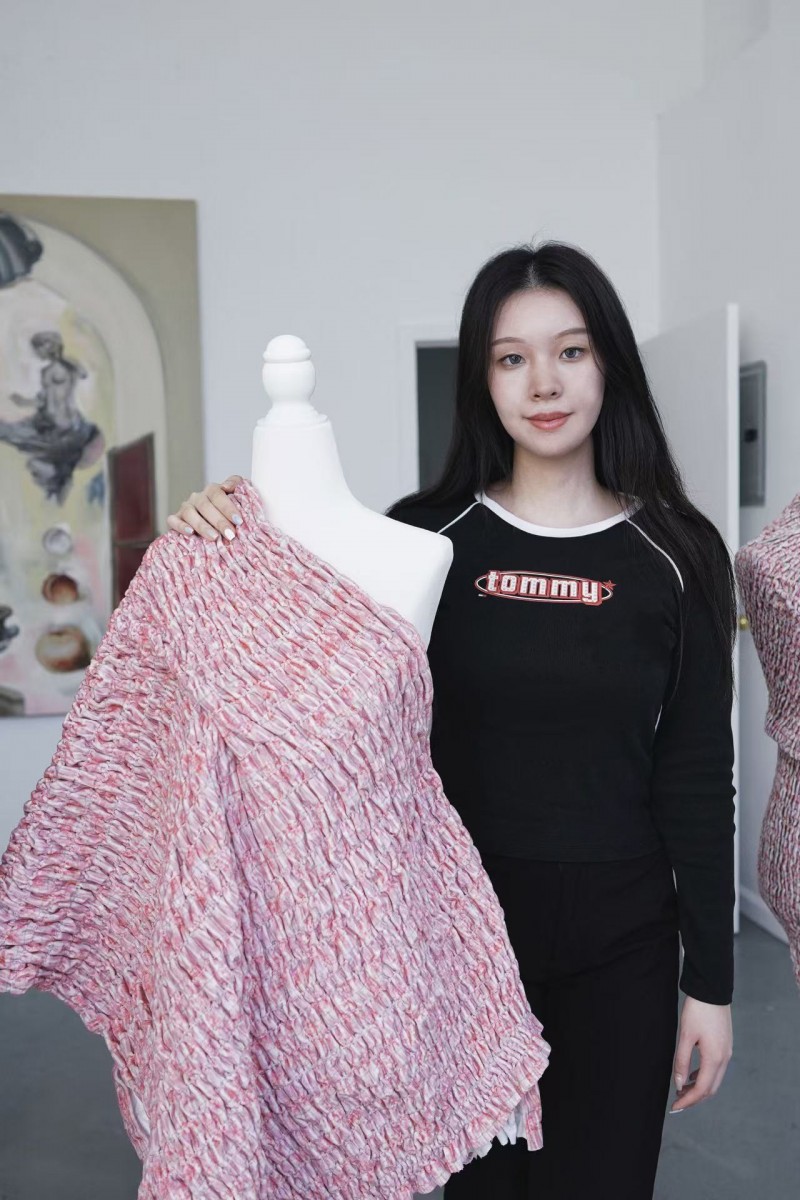 在那次展览中,李霈阳(Camille Li)以服装为表达载体,带来作品《Live Sashimi》。围绕 “美感背后的伦理张力”,借鉴日本生食文化中对自然敬畏与利用并存的矛盾,通过弹性线抽褶、重复纹理与鱼类意象叠加,将布艺纺织结构转化为可身体感知的叙事表达。作为展览中唯一的布艺纺织与服装方向创作,其材料实验性与概念深度的融合,获得该展览策展人、Utopia 平台创始人 Lihsing Wang 的高度评价,称其为展览跨学科结构提供了不可替代的材料视角。