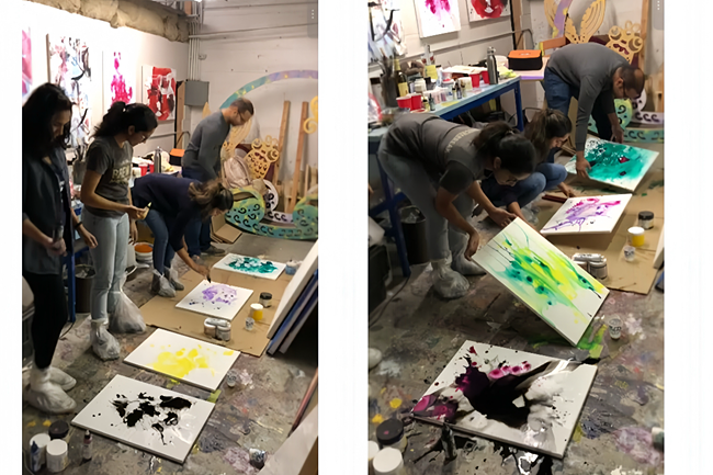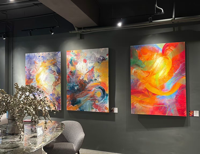 而在公益价值层面,简丹的过往经历成为了关键支撑。从2014年在美国组织居民共同制作环保灯饰,到2019年在旧金山开设疗愈课程,再到2024年与澳门市民合作创作,她始终践行“艺术疗愈+社群融合”的理念。此次展览中,“心境调色盘”互动区、沉浸式色彩环境等设计,正是这一理念的落地:不同群组的人——无论是两代人、夫妻,还是同事、邻居,都能在安全、无评判的空间里,用色彩表达情绪、释放压力。比如高压人群可以通过泼洒颜料释负,有隔阂的群体能在共同创作中加深理解,弱势群体也能在完成作品时建立自信。