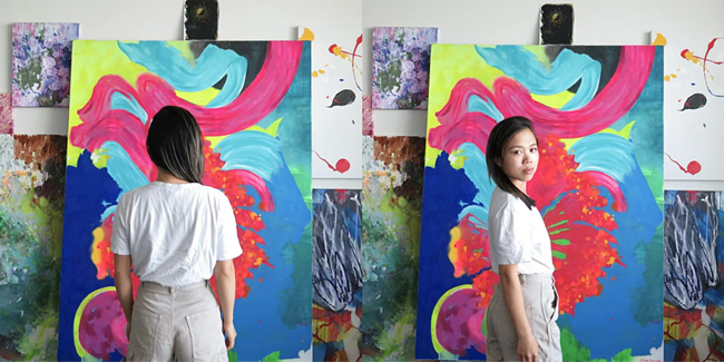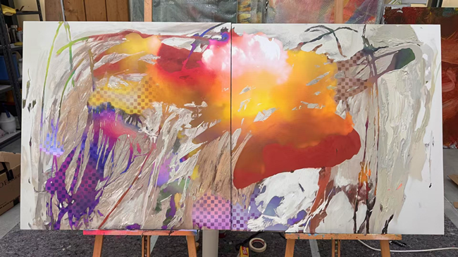 青年艺术家简丹的艺术创作,始终围绕“虚实共生”展开。被中国青春艺术驻地评选为十大最值得关注的新锐艺术家之一的简丹,2013年毕业于美国马里兰艺术学院,多年的跨文化经历让她对“边界”有着独特感知。她的创作手法极具辨识度——将AI图像生成、数据分析技术,与即兴泼洒、油画刀刻纹理、模板喷绘等传统艺术技法相融合,让数字艺术的科技感与实体创作的温度碰撞出奇妙火花。“大自然的色彩是我的灵感库,”简丹说,“我想通过这种混合媒材的方式,呈现数字艺术的独特美学,也让观众在作品中感受到虚实交织的感官体验。”